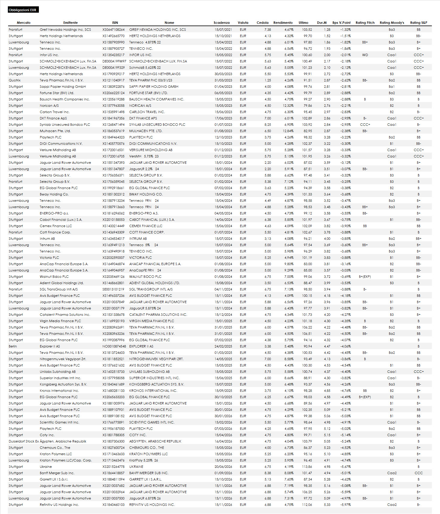 ATTENZIONE: si rammenta che i bond High Yield hanno un rischio spesso non trascurabile in termini di Credit Risk, per cui non sono da considerarsi come suggerimenti operativi, bensì come mere segnalazioni che non saranno poi seguite in modo organico. Pertanto, chi decidesse di prendere spunto da tali segnalazioni dovrà poi seguire in via autonoma l’andamento del titolo e le eventuali notizie relative all’emittente, controllando con frequenza il mercato.