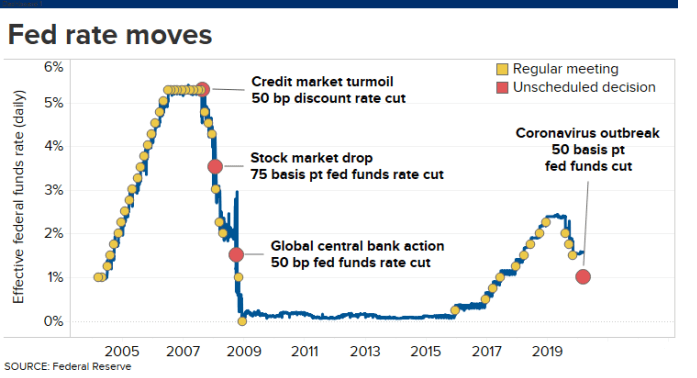 La FED ha anche annunciato un taglio di mezzo punto percentuale sull’interesse che paga sulle riserve bancarie in eccesso. L’IOER viene utilizzato come guardrail per il tasso dei FED FUNDS. In una nota, la FED ha dichiarato: “Il Coronavirus pone rischi in evoluzione per l’attività economica. Alla luce di questi rischi e a sostegno del raggiungimento dei suoi massimi obiettivi di occupazione e stabilità dei prezzi, il Federal Open Market Committee ha deciso oggi di ridurre l’intervallo target per il tasso dei fondi federali”.