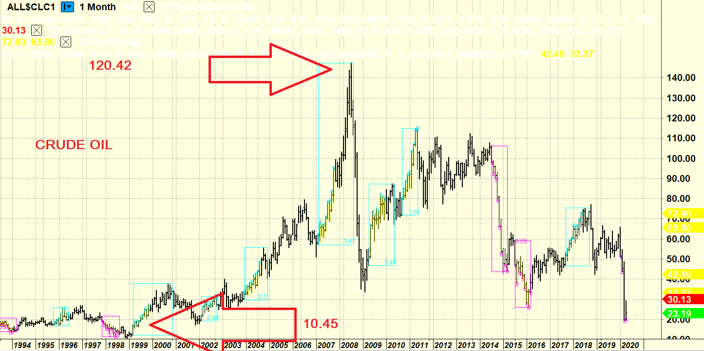 Non fare quello che facevano gli altri, comprare il petrolio a sentimento. Ora sul petrolio notiamo un accenno di doppio minimo e noi entriamo con il portafoglio Challenger a metà della congestione ovvero non in stop ma limite. Inoltre notate il grafico qui sotto del Crude Oil mensile: siamo su un minimo ultra – ventennale o addirittura trentennale. Il grafico mostra un massimo a 120.42 e un minimo a 10.45. Noi compriamo a cavallo dei 20 diciamo che può anche andare a zero ma siamo dalla parte dei bottoni.