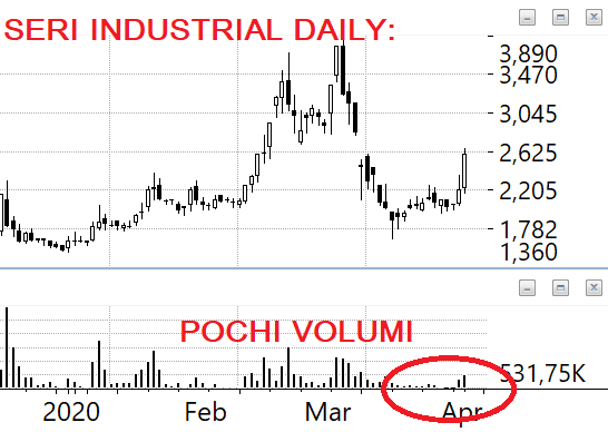SERI INDUSTRIAL: un lettore chiede di questa azione che ha fatto due barre di rovesciamento ma i volumi sono poverini. Ne vorrei vedere di più, mi sa che si tratta di un movimento di rimbalzo tecnico destinato ad esaurirsi. Se dovesse uncinare magari sì ma ci vogliono più volumi.