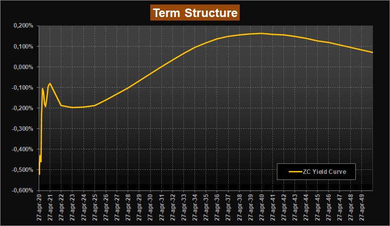 Consueta lettura del mercato obbligazionario attraverso la ZC-Yield Curve, in cui notiamo il perdurare di una sostanziale lateralità, con rendimenti che oscillano in un range ristretto, sempre schiacciati verso i recenti minimi. Ora abbiamo rendimenti negativi sino alle scadenze 2030 e la parte a lunga scende lievemente portandosi in area 0,07% sulle scadenze 2050. La scadenza a 10 anni torna di poco negativa e si attesta ora in area -0,03%. La curva mantiene la forma “schiena d’asino”, come già osservato da diverse settimane, molto ripida e in territorio negativo sul tratto da breve a medio, per toccare un massimo ora poco sopra area 0,16% per le scadenze 2039-2041 per poi invertire e tornare a scendere gradatamente nel tratto a medio-lungo. In lieve contrazione anche i forward su Euribor 6 mesi che sul tratto a lunga si portano ora sotto area 0,50% ma recuperano qualcosa sul tratto a breve che è ora nei pressi in area -0,30%.