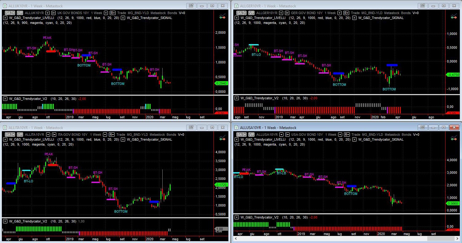 Osservando – a livello di analisi integrata – le curve dei rendimenti dei principali benchmark decennali non si osservano cambiamenti importanti, salvo che sul nostro Btp, sotto evidente pressione in attesa dell’appuntamento europeo di giovedì 23 aprile. Al momento quindi, in ottica strategica, si confermano le evidenze del modello, con Trendycator che rimane SHORT sull’area UK, con i rendimenti in fase laterale poco sotto area 0,30%. Trendycator confermato SHORT anche sull’area BUND con il rendimento del decennale tedesco in lieve contrazione e ora poco sopra area -0,50%. Nuove tensioni sul nostro Btp, evidentemente condizionato dalle trattative in sede europea per le misure da mettere in campo. Ora il Trendycator è in conformazione NEUTRAL, avendo abbandonato lo SHORT a causa della nuova impennata dei rendimenti, che ora viaggiano oltre il 2%. Infine, in lieve contrazione i rendimenti USA, con Trendycator che mantiene ben saldo lo SHORT sul decennale che ora gravita poco sotto area 0,60% di rendimento.