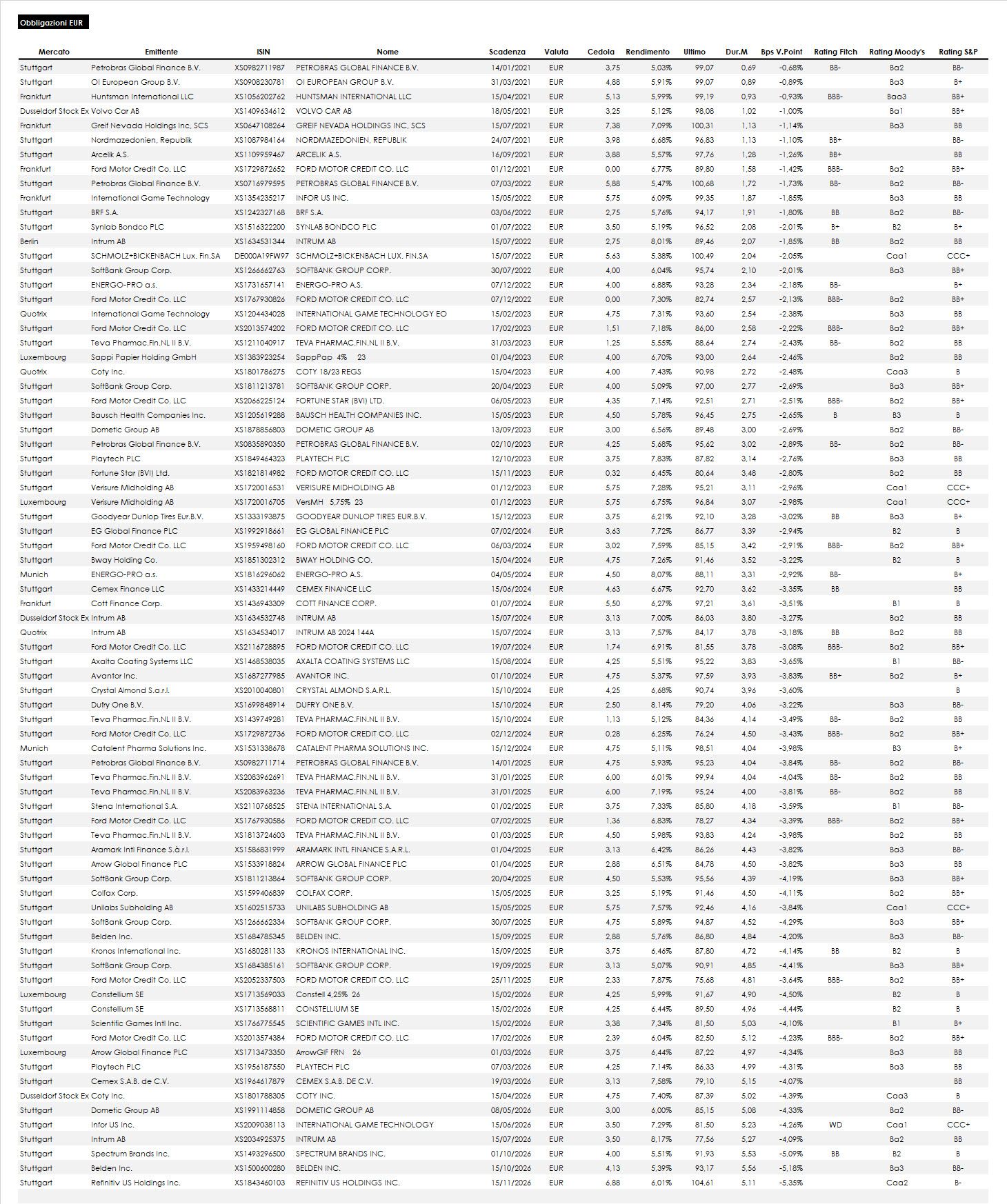 ATTENZIONE: si rammenta che i bond High Yield hanno un rischio spesso non trascurabile in termini di Credit Risk, per cui non sono da considerarsi come suggerimenti operativi, bensì come mere segnalazioni che non saranno poi seguite in modo organico. Pertanto, chi decidesse di prendere spunto da tali segnalazioni dovrà poi seguire in via autonoma l’andamento del titolo e le eventuali notizie relative all’emittente, controllando con frequenza il mercato.