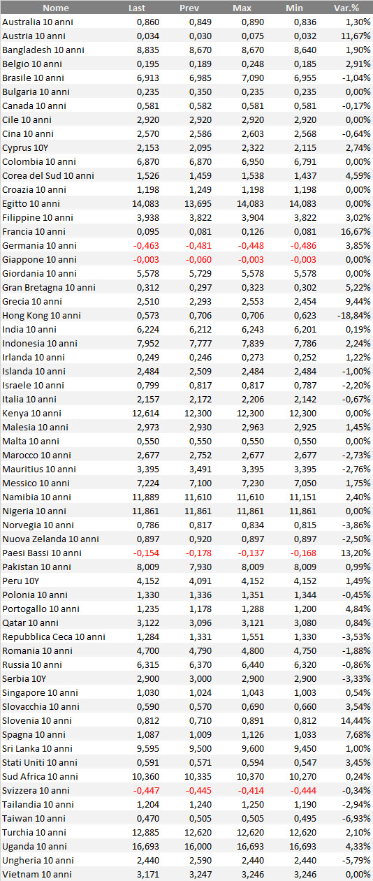 Analisi sotto forma di ranking dei bond governativi mondiali con qualunque rating. In alcuni casi, per alcuni emittenti o per alcune valute, il rapporto rischio/rendimento di questi bond può essere anche piuttosto speculativo. Il ranking considera i bond benchmark decennali in tutte le valute di emissione.