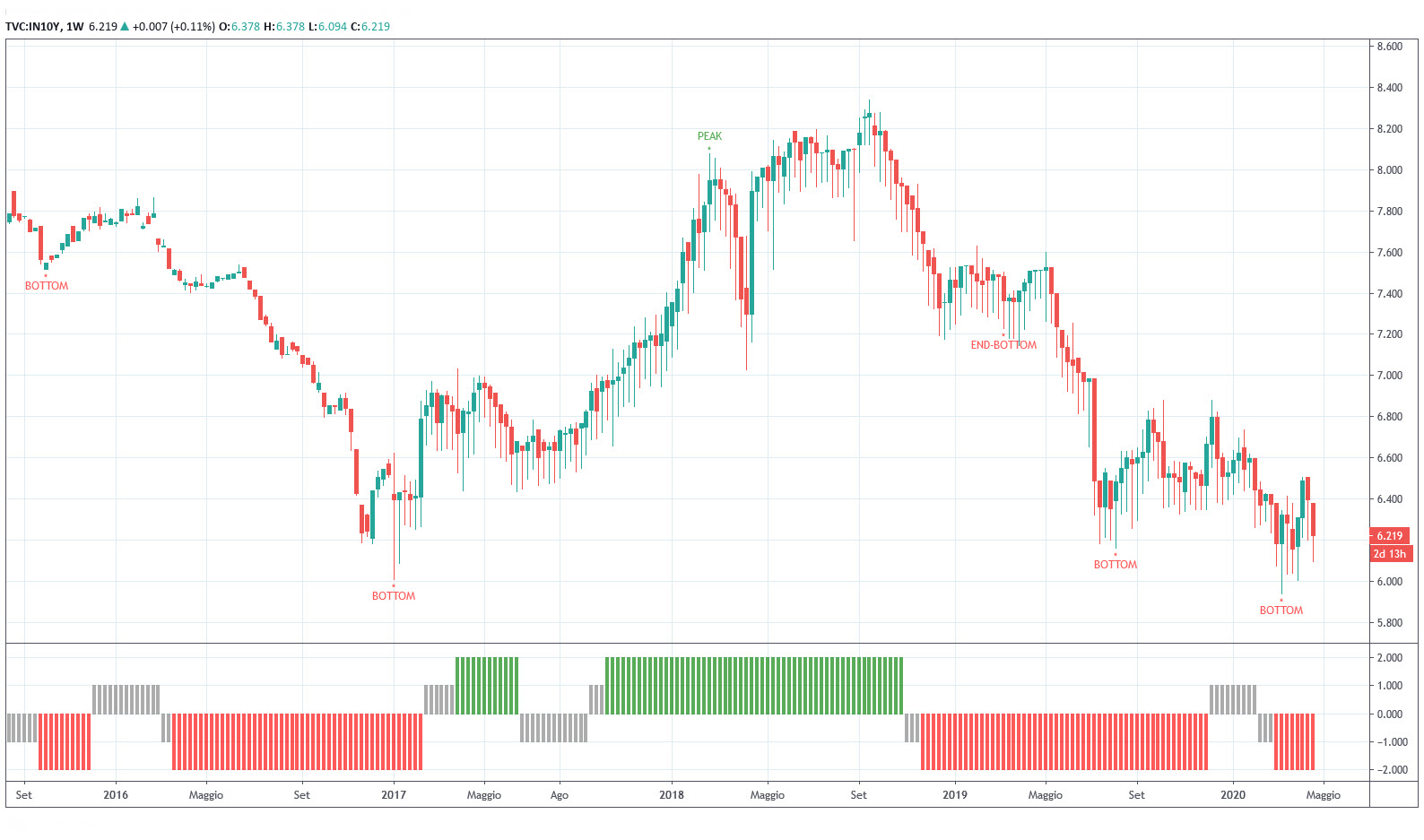 Questa settimana diamo uno sguardo al governativo indiano, che offre un rendimento del 6% e sta vivendo un buon momento, con rendimenti in discesa (e quindi prezzi in salita) da fine 2018, come si vede dal grafico qui sotto. Dopo un massimo di rendimento oltre l’8% è iniziata un costante ridimensionamento che ha portato il decennale indiano sui minimi attuali nell’intorno di area 6%. Il modello Trendycator indica SHORT, di fatto, da fine 2018 e per ora conferma questa impostazione. L’India gode di rating investment grade, posto che Fitch le assegna un BBB- e Moody’s un Baa2.