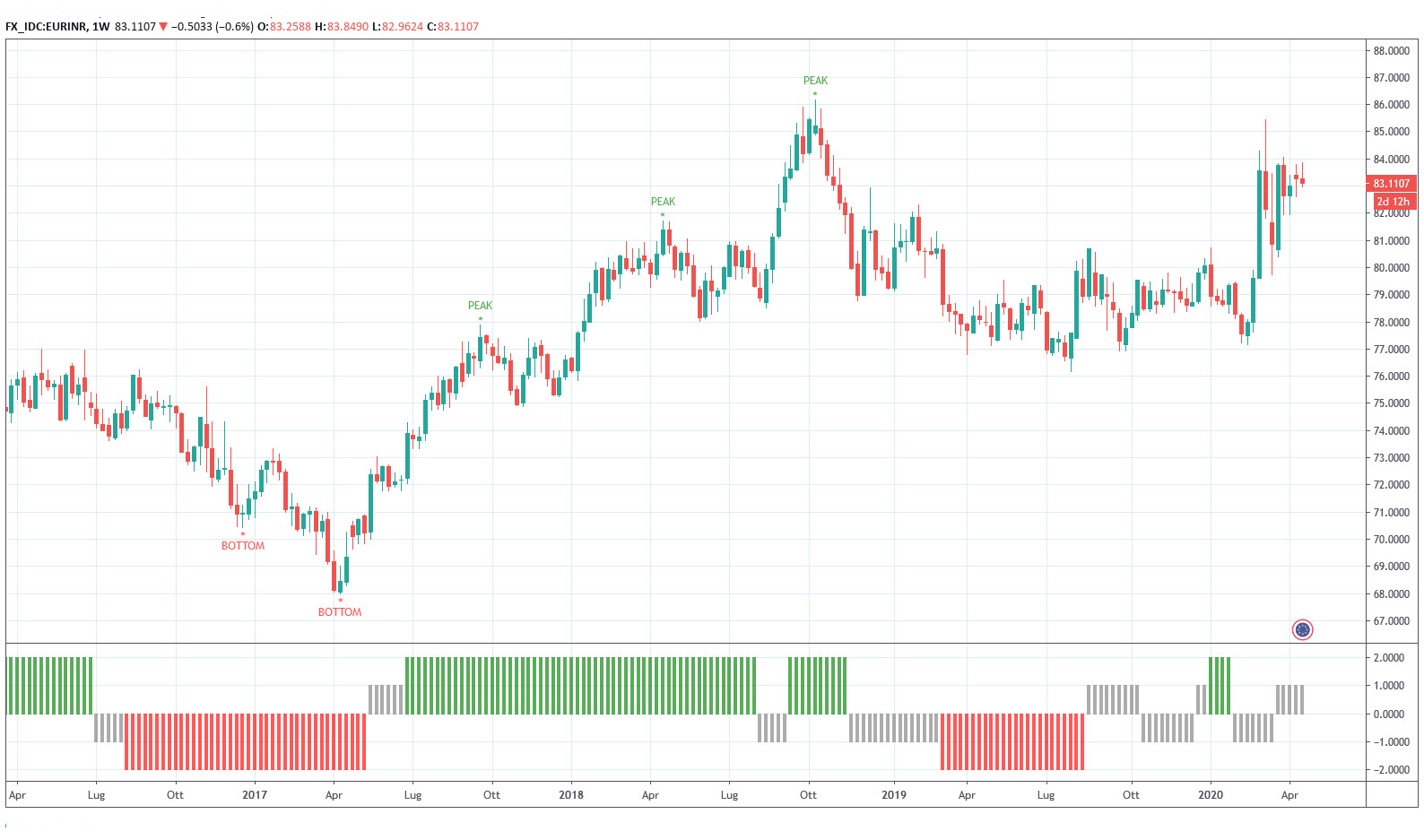 La Rupia indiana (INR) sta vivendo un momento di debolezza contro Euro, con il cambio che gravita poco sotto area 84, non lontano dai massimi del 2018 a 86. Il modello Trendycator è in fase NEUTRAL anche se la volatilità del cambio non è proprio trascurabile.