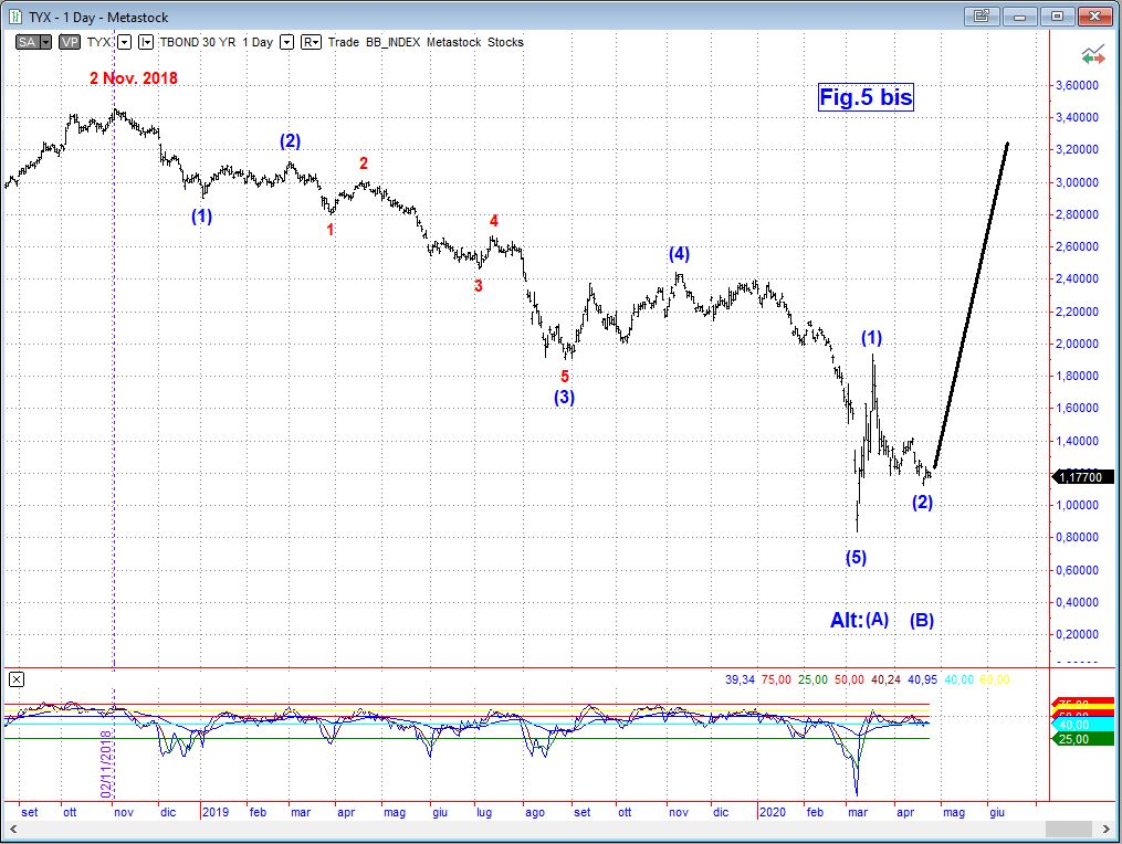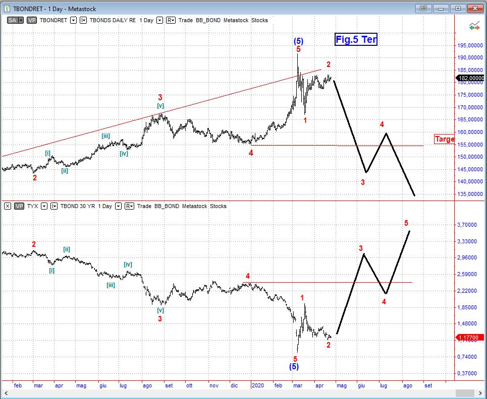 Sul trentennale americano l’onda (2) dovrebbe essere conclusa o vicinissima a farlo. Appena l’onda (3) inizierà a dispiegarsi dovremmo vedere rapidamente i prezzi scendere e i rendimenti salire.