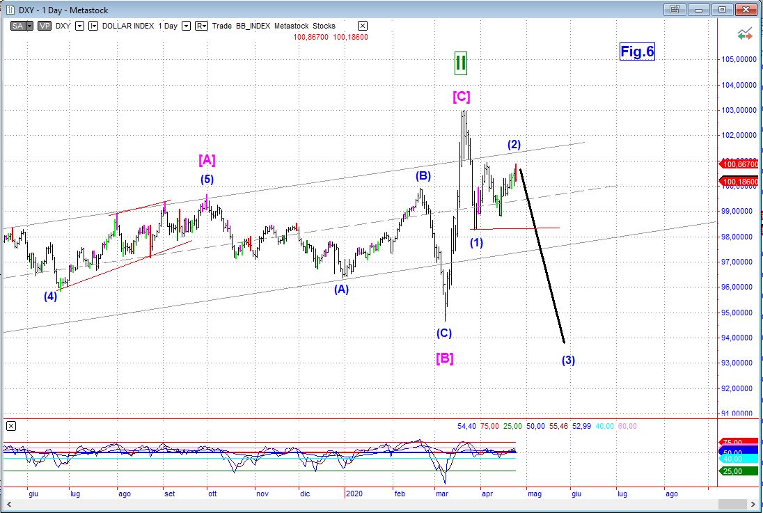 Ovviamente al di là dell’etichettatura serve la conferma che questo conteggio possa essere corretto e quindi serve che il minimo di onda [i] venga rotto al ribasso diversamente non possiamo fare altro che restare alla finestra. Quindi se l’onda [2] è realmente terminata sul massimo del 17 Aprile e quel massimo tiene, i prezzi dovrebbero già iniziare a scendere con forza dalla settimana prossima, mentre se quel massimo non tiene e verrà superato allora significa che l’onda [2] non era conclusa e servono altre suddivisioni. Sotto i tre indici su scala daily.
