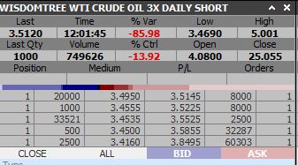 Nel caso specifico ho preso l'ETC Wisdomtree WTI crude oil leva 3 short (trattasi di exchange trading commodity. Per maggiori informazioni Vi rimando al sito ufficiale di Borsa Italiana che è molto dettagliato e preciso: https://www.borsaitaliana.it/etc-etn/formazione/cosaunetc/cosaunetc.htm )