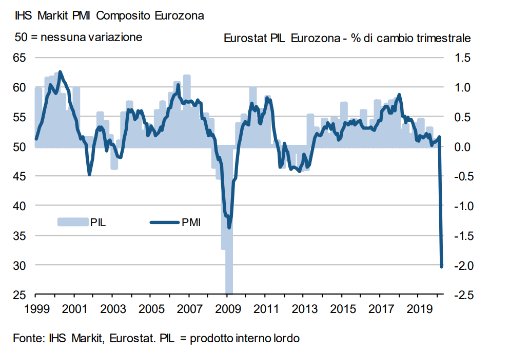 L’Indice PMI uscito venerdì mostra come siamo a livelli di minimo STORICO di caduta dell’attività economica sia in Germania, Francia, Spagna, Irlanda e Italia, come dire l’intera Europa. La perdita di posti di lavoro in questi Paesi è stata peggiore dal 2009, con la Spagna in testa.