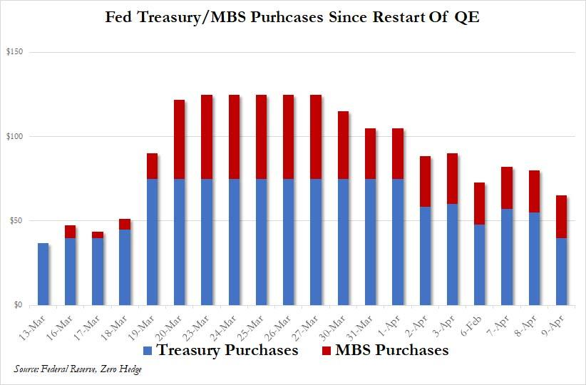 Dal suo programma iniziale di acquisto di obbligazioni pari a 75 miliardi $ al giorno, si è passati ai 60 miliardi $ al giorno nella scorsa settimana, si è arrivati all’annuncio di un'altra diminuzione pari a 50 miliardi $ al giorno per la prossima settimana. Avendo implicitamente confermato che ora c'è una carenza di obbligazioni, come dimostrato dai recenti pronti contro termine che hanno visto zero richieste, in quanto invece di utilizzare i pronti contro termine e parcheggiare, come collaterale a garanzia le obbligazioni, semplicemente hanno deciso di venderle direttamente alla FED. Quindi la FED di NY ha annunciato che continuerà a ridurre il suo acquisto di obbligazioni "QE illimitate" la prossima settimana.