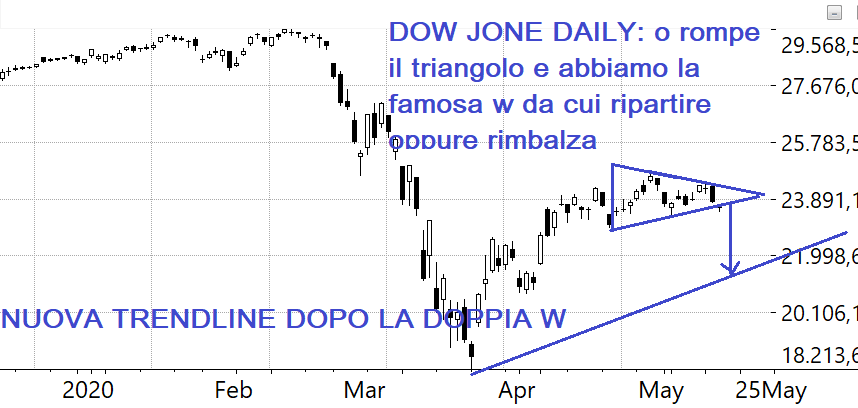 Siamo a cavallo della trendline inferiore del Dow Jones daily e il presidente Powell parlerà oggi pomeriggio dei tassi negativi degli USA e altre amenità.