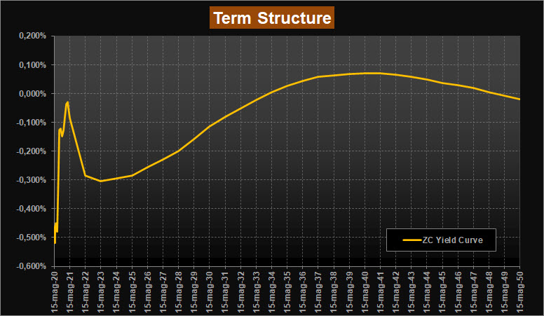La lettura della ZC-Yield Curve questa settimana evidenzia una sostanziale stabilità dei rendimenti su tutto il tratto di curva. Abbiamo sempre rendimenti negativi sino alle scadenze 2033 e la parte a lunga si conferma di fatto stabile e sempre negativa in area -0,02% sulle scadenze 2050. La scadenza a 10 anni rimane in territorio negativo seppur con una lievissima salita che la vede ora in area -0,11%. La curva mantiene la forma a “schiena d’asino” e si mantiene stabile anche sotto il profilo dello “shift-down” parallelo osservato già qualche settimana fa a partire dalle scadenze 2022, stabili nei pressi di area -0,30%, per toccare un massimo sempre sotto area 0,10% per la scadenza 2040. Leggera contrazione invece per i forward su Euribor 6 mesi che sul tratto a lunga sono ora diretti verso area 0,30% mentre si confermano stabili in area -0,50% sul tratto a breve.