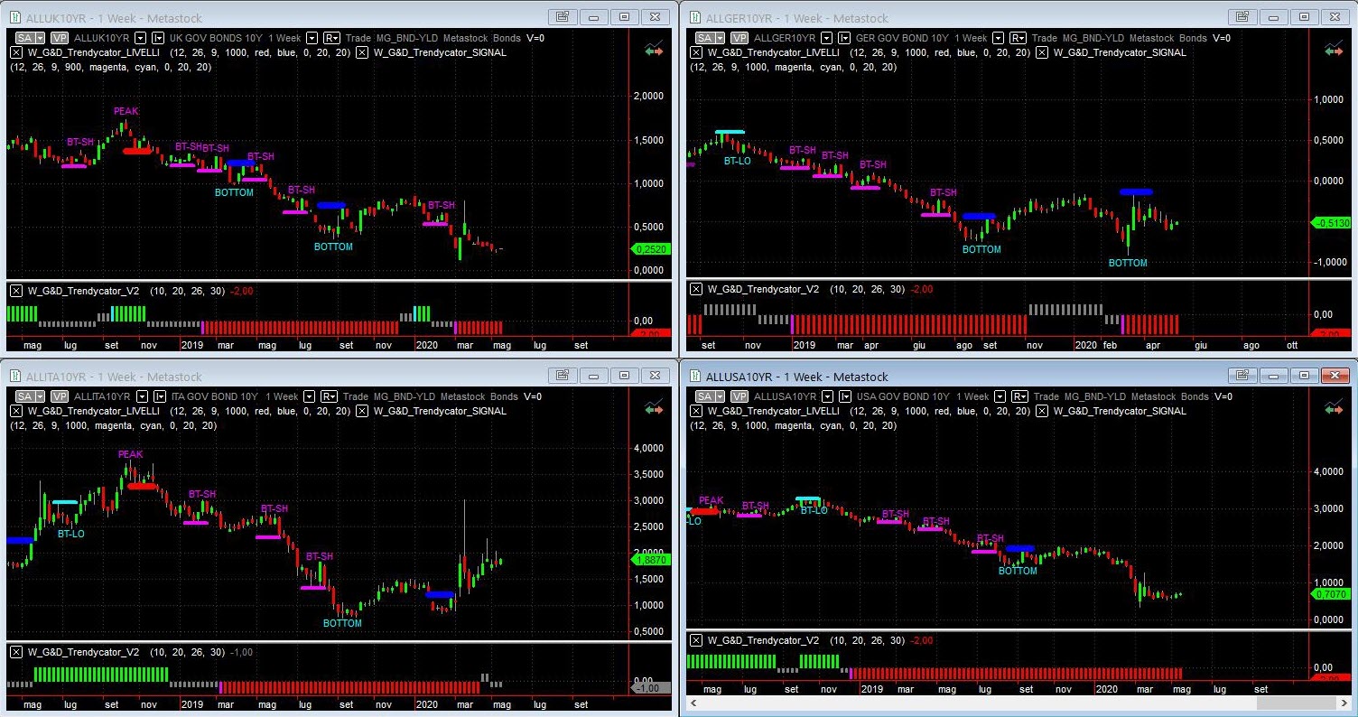 Osservando – a livello di analisi integrata – le curve dei rendimenti dei principali benchmark decennali osserviamo una sostanziale stabilità del quadro in ottica strategica del modello Trendycator rispetto a quanto visto la settimana scorsa. Trendycator rimane SHORT sull’area UK, con rendimenti sempre in area 0,20% dopo la forte contrazione avvenuta a inizio marzo. Il modello è ancora SHORT anche sull’area BUND con il rendimento del decennale tedesco inchiodato tra area -0,50% e area -0,60%. Permangono ancora motivi di tensione sul nostro Btp, nonostante anche Moody’s abbia confermato il nostro rating a corredo di un’analisi e un commento per nulla negativo sul debito del nostro Paese. Ad ogni buon conto, Trendycator si conferma NEUTRAL con il rendimento ora in area 1,90% e spread in area 240 bps. Infine, sempre quasi immobili i rendimenti USA, con Trendycator saldamente SHORT e con il benchmark decennale ora nei pressi di area 0,70% di rendimento.