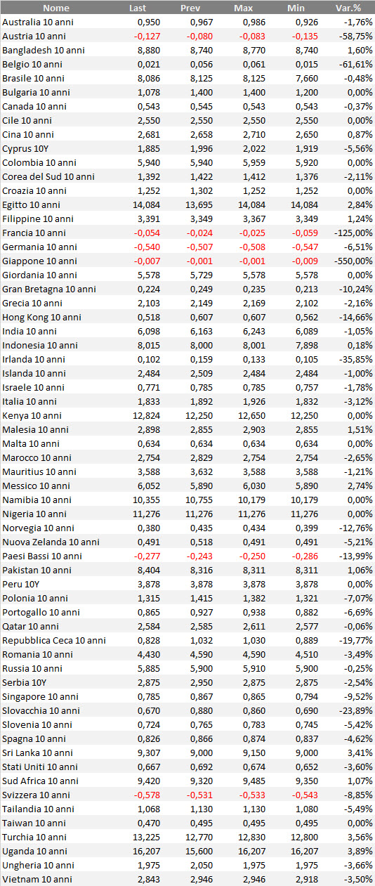 Analisi sotto forma di ranking dei bond governativi mondiali con qualunque rating. In alcuni casi, per alcuni emittenti o per alcune valute, il rapporto rischio/rendimento di questi bond può essere anche piuttosto speculativo. Il ranking considera i bond benchmark decennali in tutte le valute di emissione.