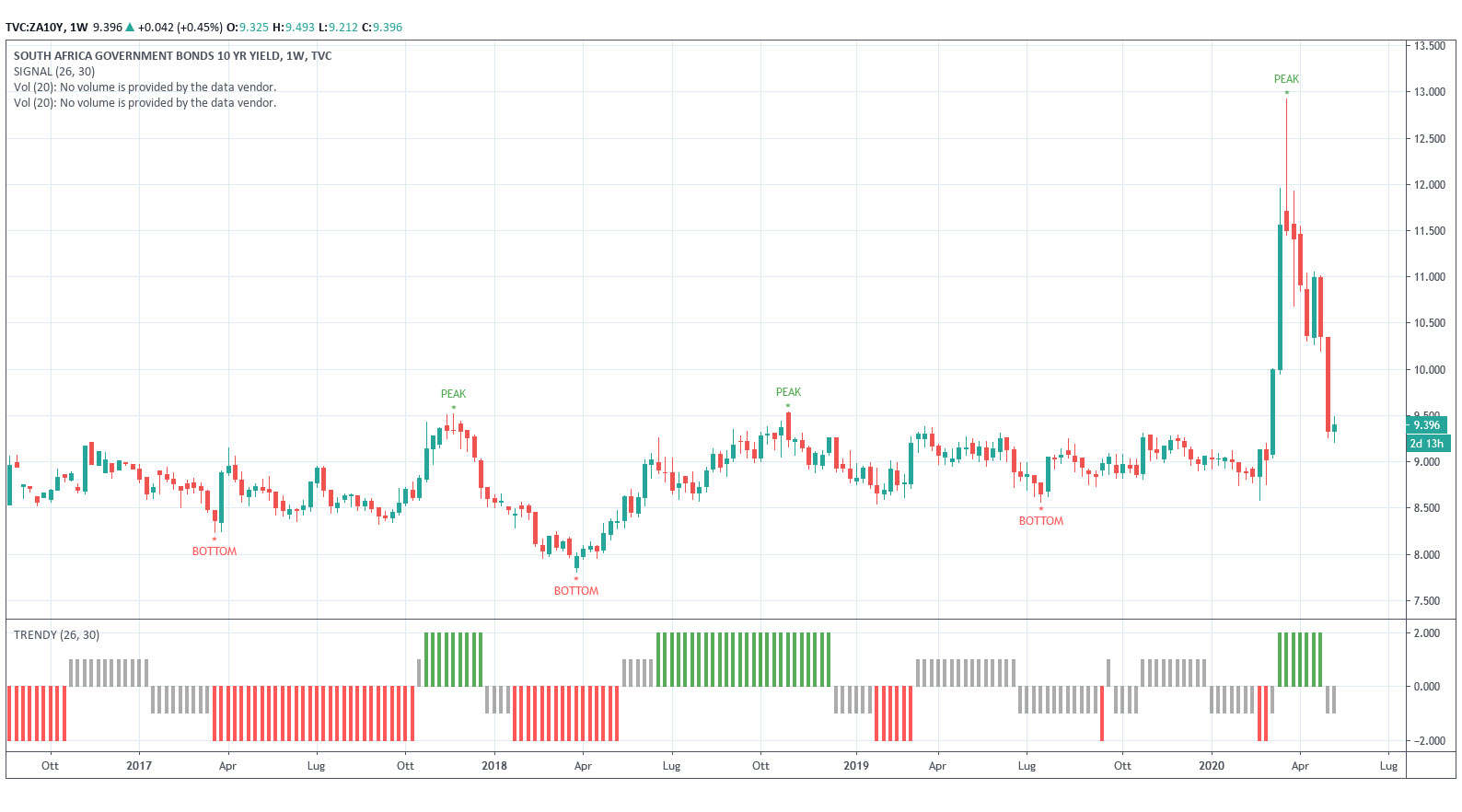 Questa settimana rimaniamo focalizzati sui bond del Sud Africa, che in tempi non sospetti (ben tre settimane fa) avevamo indicato come potenziali d’interesse, giocando un po’ d’anticipo sulle evidenze del modello Trendycator. Ebbene, dopo tre settimane su alcuna stampa specializzata un articolo analizza i motivi di appeal dei bond in Rand e intanto il rendimento si è ridotto di parecchio da quando per la prima volta ne abbiamo scritto su queste colonne. Idea quindi assolutamente azzeccata.