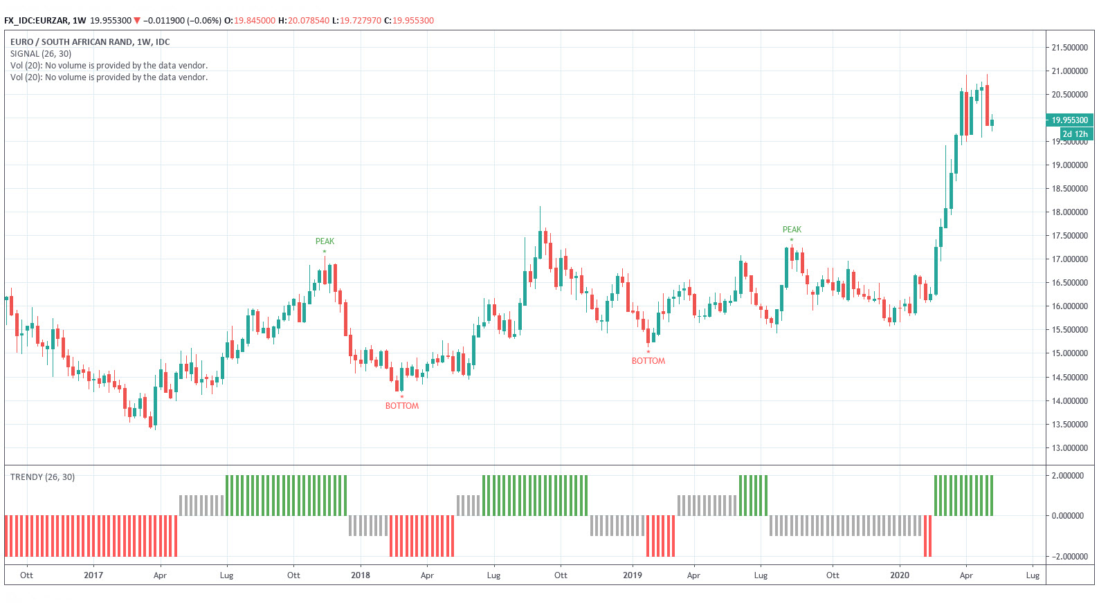 Sotto il profilo del rischio cambio, il Rand sudafricano (ZAR) rimane stabile nei pressi dei massimi dopo la lieve correzione che lo ha portato nell’intorno di area 20. Il modello Trendycator ancora in stato LONG e per ora non abbiamo elementi per attenderci un suo cambiamento.