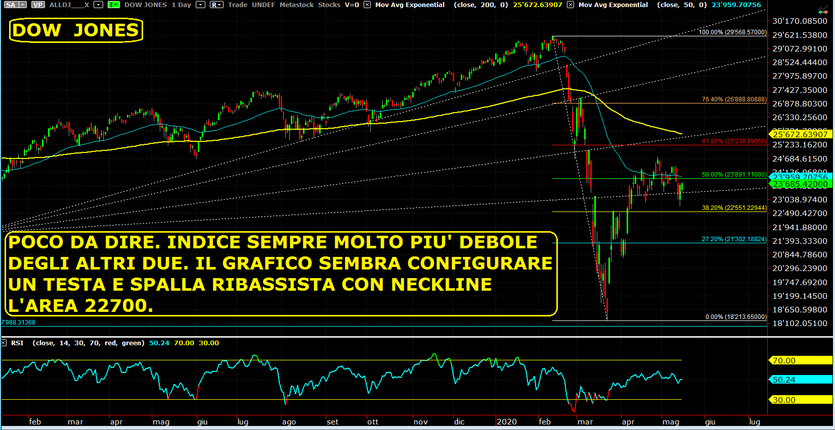 Più debolezza sull’indice S&P500, che sta disegnando un wedge a M tra i livelli in area 2950 e 2750. Lasciamo inalterato il conteggio delle onde in quanto il ritracciamento del 61,8% del range max/min di onda A, congiuntamente alla M.M. Exp a 200 sta facendo il suo dovere fermando il rialzo. La rottura della resistenza di 2950 proietterebbe i prezzi alla successiva resistenza posta al 76,4% del ritracciamento in area 3110/3130 ma i serbatoi del propellente sembrano scarichi. Al contrario primo supporto in area 2740/2730 (ritracciamento del 27,2% dell’onda B (?) ed ulteriore discesa in area 2660 (ritracciamento del 38,2%).. La settimana di contrattazione si è chiusa a 2863.70 con una perdita del – 2,26% che ha portato il deficit da inizio anno a – 11,36%.