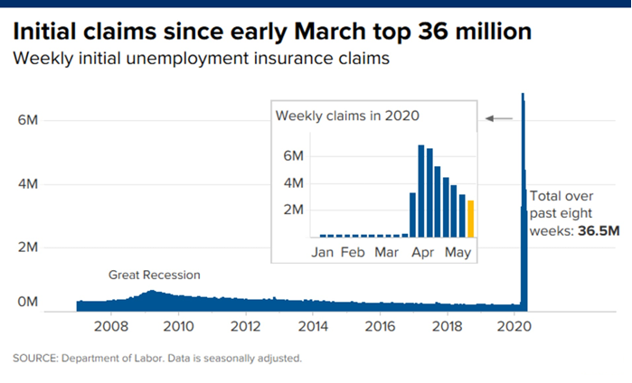 Veniamo ora all’uscita dei dati sulle nuove richieste di sussidi di disoccupazione (claims), che in settimana sono scese solo di 195.000 unità a 2.981.000 contro le 3.176.000 della settimana scorsa, mentre le attese erano per 2.500.000. Le richieste continuano ad essere enormi. Ma le richieste di disoccupazione continua sono rimaste sostanzialmente quasi stabili a 22.833.000, 500.000 in più della scorsa settimana, contro attese per 25.120.000. Resta da chiarire il motivo: alcune aziende hanno richiamato i lavoratori oppure alcune persone hanno già perso il diritto? Sembra più probabile la prima interpretazione.