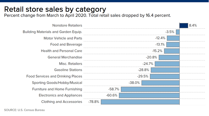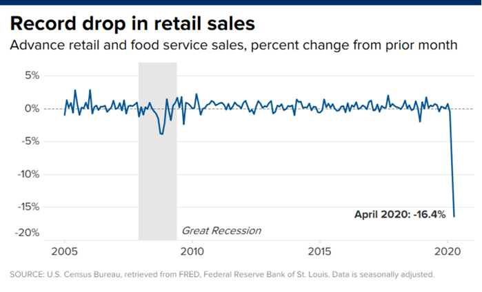 Semplicemente terrificante il dato sulle vendite al dettaglio di aprile. Il dato riportato a -16.4% ha raddoppiato il calo avuto in marzo, ed è sceso di oltre 4 punti sotto il consenso, posto a – 12%. Il dato “core ex-auto e carburanti” è sceso a – 17,2% dal – 4,0% di marzo ed oltre il doppio del consenso posto a – 8,6%, stessa cosa per il dato "control Group" sceso a – 15,3% rispetto al + 3,1% di marzo ed oltre il triplo del consenso a – 4,6%. Nel dettaglio si notano i crolli di vestiario (- 78%), mobili (- 58,7%), dispositivi elettronici (- 60%) e perfino il cibo (- 12%) dopo il balzo del mese precedente. E' evidente l'impatto del lockdown, e quindi questi numeri, storici nella loro negatività, costituiscono sicuramente il minimo relativo.