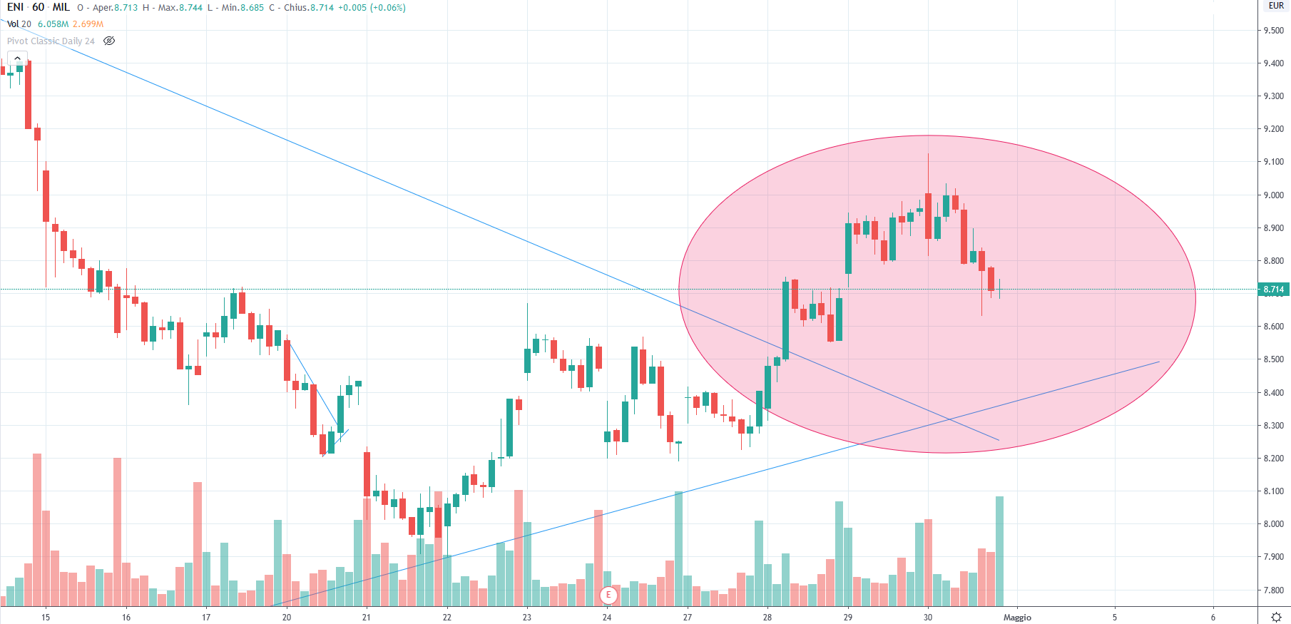 Concentrandoci sulla parte cerchiata da un ellisse, è intuibile la forza della rottura in zona 8.5€ che ha spinto la crescita del prezzo sino ai 9.10€, salvo poi ripiegare.