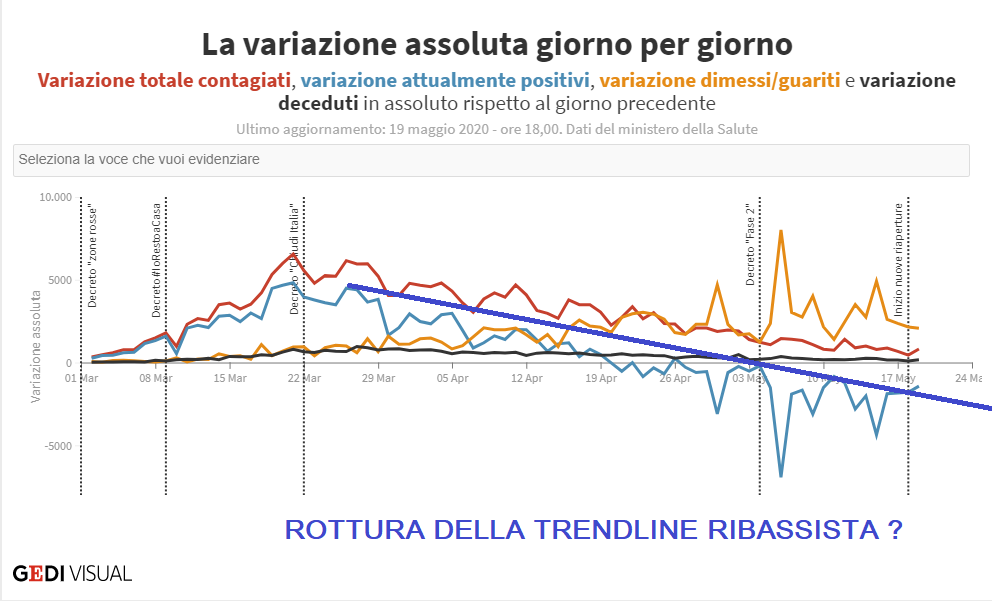 Purtroppo per noi le trendline si applicano a tutti i grafici, anche a quelli del Coronavirus. E ieri abbiamo avuto un primo tentativo di rottura della trendline ribassista sulla curva dei nuovi contagi.