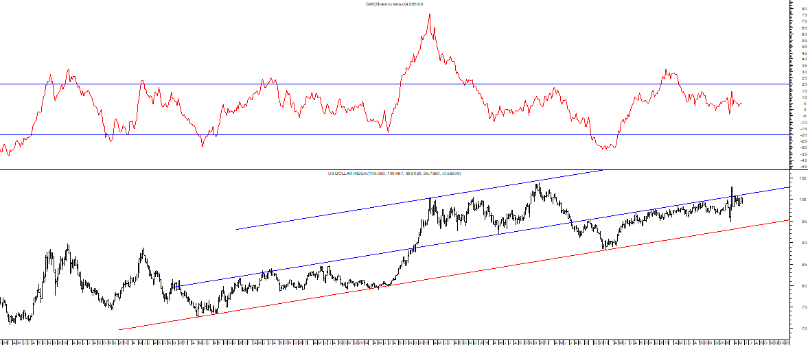 Il Dollar index è inserito in un trend ascendente di lungo periodo iniziato nel 2011 e sostenuto di un supporto dinamico, ancora relativamente distante, e situato a 94 circa.