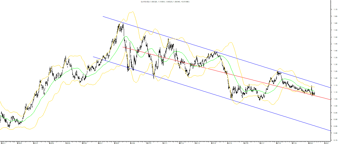 In effetti, osservo, mio malgrado, una lunga agonia della valuta europea che scivola lentamente verso la retta rossa.