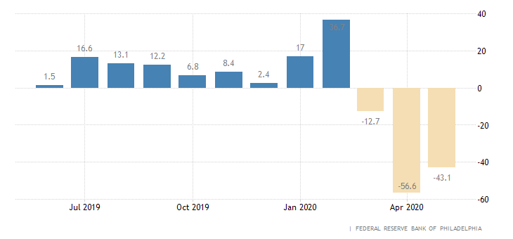 Il dato preliminare sull’attività economica manifatturiera nell’area di Philadelphia è migliorato un po' a Maggio a – 43,1 rispetto ad Aprile – 56,4, ma meno delle attese poste a 41,5. Migliorano leggermente alcune componenti ma soprattutto emerge un’aspettativa di recupero elevatissima (in termini di condizione economica generale ma anche di nuovi ordini) entro i prossimi 6 mesi a 49,7.