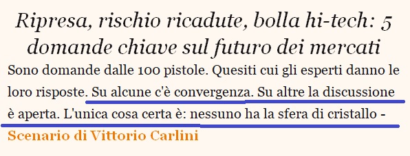 Questa è bella e ve la devo raccontare ... presa dalla mail quotidiana degli abbonati a Il Sole 24 Ore: su alcuni aspetti del futuro c'è convergenza tra gli esperti (e quindi succederà l'opposto aggiungo io) e su altri no e comunque state tranquilli ... non v'è certezza del domani. Parola de Il Sole 24 Ore e come non credere loro ... e pofforbacco !
