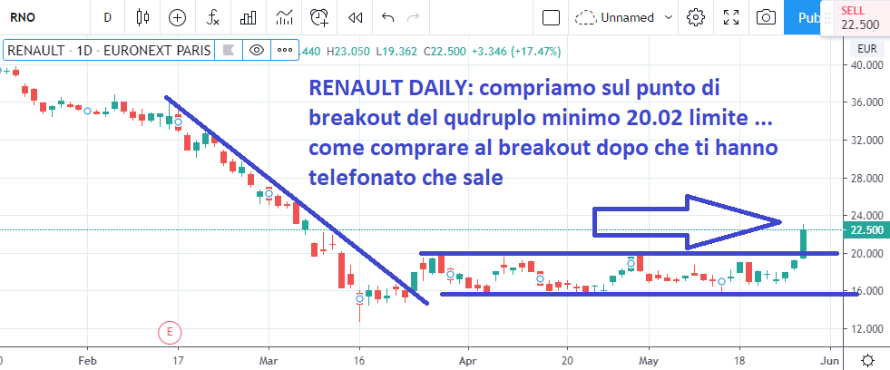 RENAULT (EURONEXT) entriamo 20.02 buy limit dopo il breakout del quadruplo minimo come comprare al punto di rottura dopo che ti hanno telefonato che sale. Mai titolo è stato più adatto che Renault ad una strategia value.