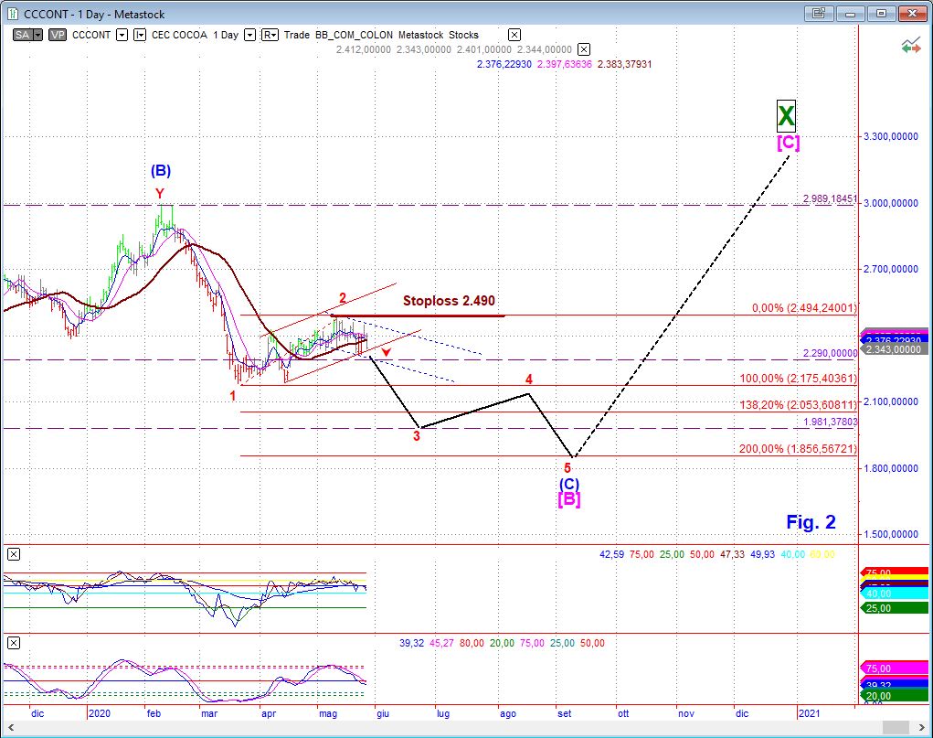 Prima di passare alle altre commodity che abbiamo in portafoglio, segnalo che sui coloniali, dette anche “soft commodity”, abbiamo il Cacao in una situazione che può diventare interessante al ribasso.