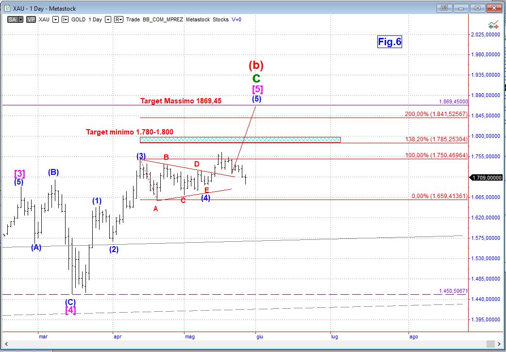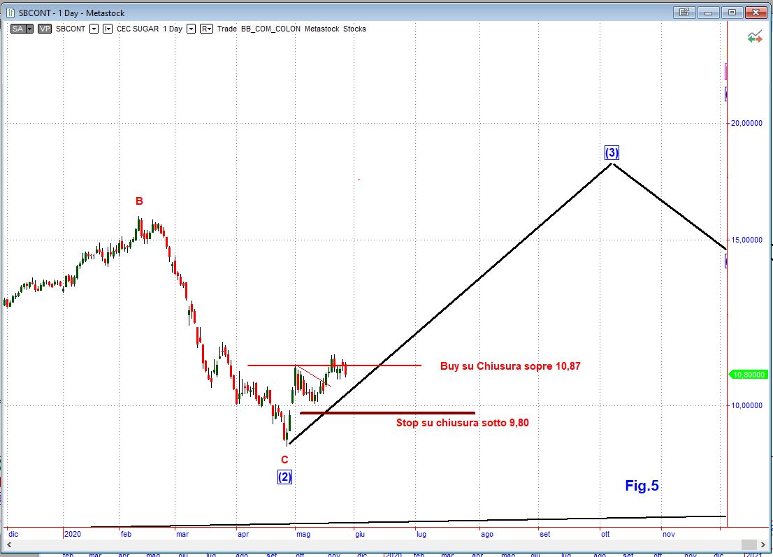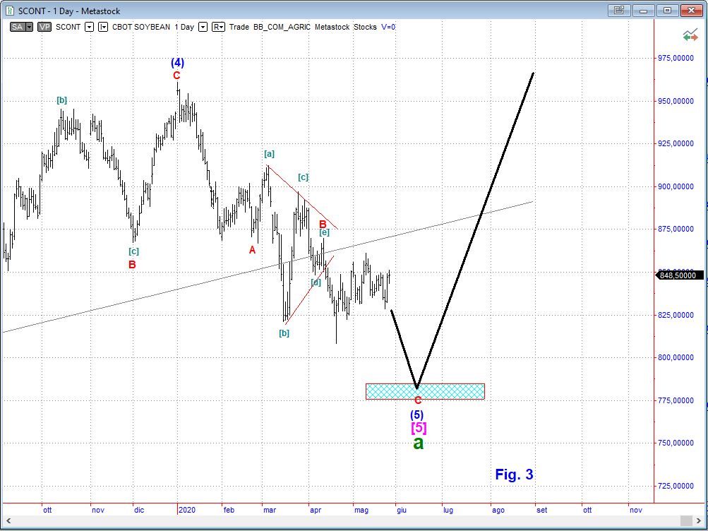 Li abbiamo parcheggiati in attesa che esauriscano il cinque onde ribassista in atto per ricaricare la posizione ed abbassare il prezzo di carico. Ormai sono entrambi in onda 5 e non dovrebbe mancare molto. La soia dovrebbe terminare la volata sui 770-775$ e il rame tra i 180 e i 190$. Sono due posizioni senza leva e coperte dal rischio cambio per cui ricaricando con un ETF o Certificate a levail ricarico sarà meno oneroso e dovrebbe recuperare più velocemente la perdita e portarci in profit.