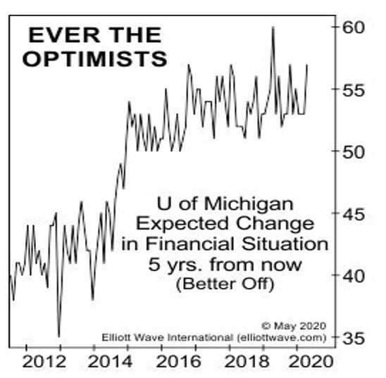 La pandemia, casuale o voluta che sia, non è questa la sede per discutere questi temi, apre un “nuovo mondo”… un territorio inesplorato dove i consumatori riconoscono chiaramente alcuni pericoli della nuova realtà. Così l'indice di fiducia dei consumatori del Conference Board è sceso a 86,9 ad aprile da un livello storicamente elevato di 118,8 a marzo. È stato il più grande declino mensile mai registrato. La cosa paradossale tuttavia è che nonostante questo, per quanto riguarda i propri investimenti, i consumatori sono compiacenti come non mai. Nel prossimo grafico pubblicato sul report mensile USA di Elliott Wave International, si vedono i risultati di un sondaggio di aprile fatto dall’Università del Michigan.