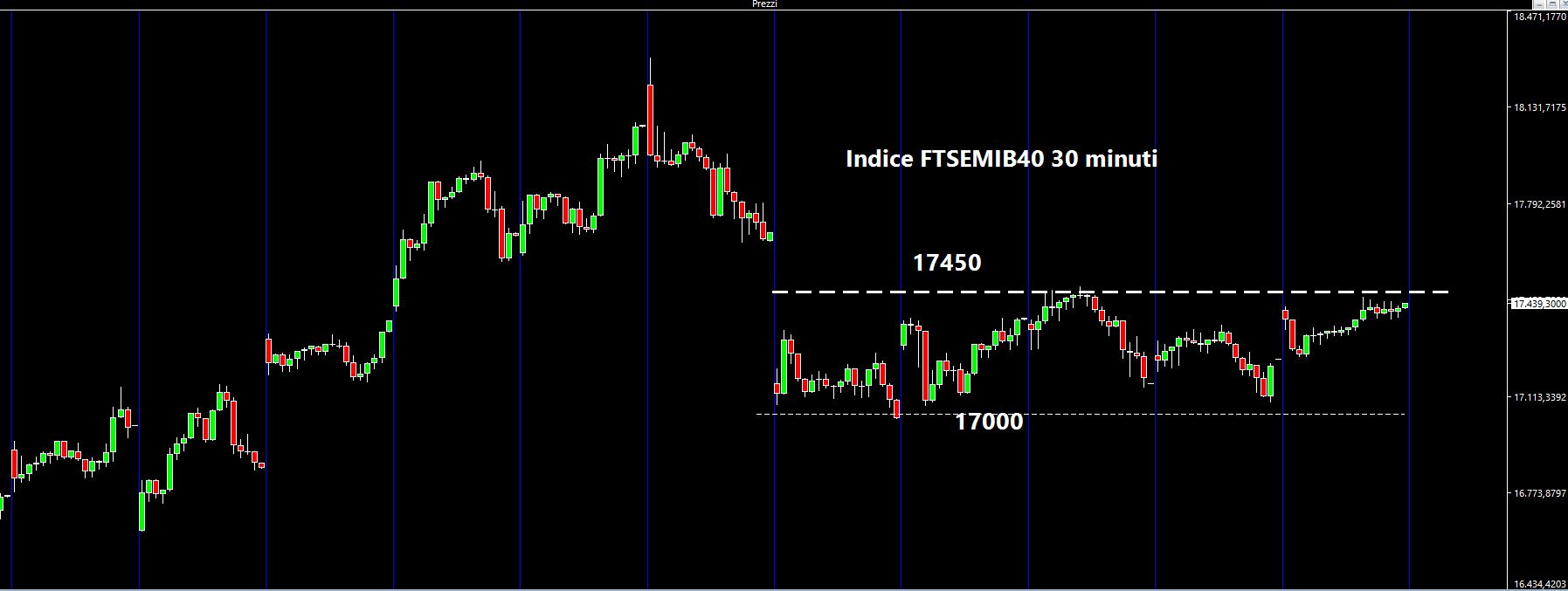Di seguito trovate il chart daily del FTSEMIB40 ed il relativo grafico a 30 minuti. Notate innanzitutto come gli estremi massimo/minimo dell'ultima ottava abbiano prodotto un range attorno ai 2.6 punti percentuali e compreso tra un minimo di 17000 ed un massimo di 17450. Oltre al basso range weekly si nota come l'indice sia imbrigliato tra due medie mobili di breve periodo: la media a 20 di colore verde e quella a 50 giorni di colore rosso. Naturalmente momenti a basso range sono prodromici di un potenziale breakout al rialzo o al ribasso.