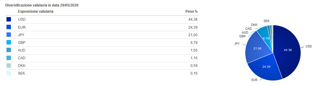 In particolare, per il Raiffessein merita dare uno sguardo alla sua attuale composizione, per capire meglio questa tipologia di movimenti. Il fondo ha infatti una discreta esposizione verso USD, come si vede dal grafico qui sotto, oltre ad una sostanziosa diversificazione in altre valute, ove il nostro Euro pesa “solo” per il 24%. Naturalmente, essendo un obbligazionario globale è più che giusto che sia così.
