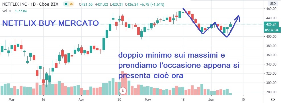 Oggi abbiamo comprato un titolo del gruppo dei boomer come Netflix perché sta disegnando una figura più tranquilla di ritracciamento sopra i massimi storici. Per questo lo abbiamo preferito alla pur meravigliosa Facebook o a Google.