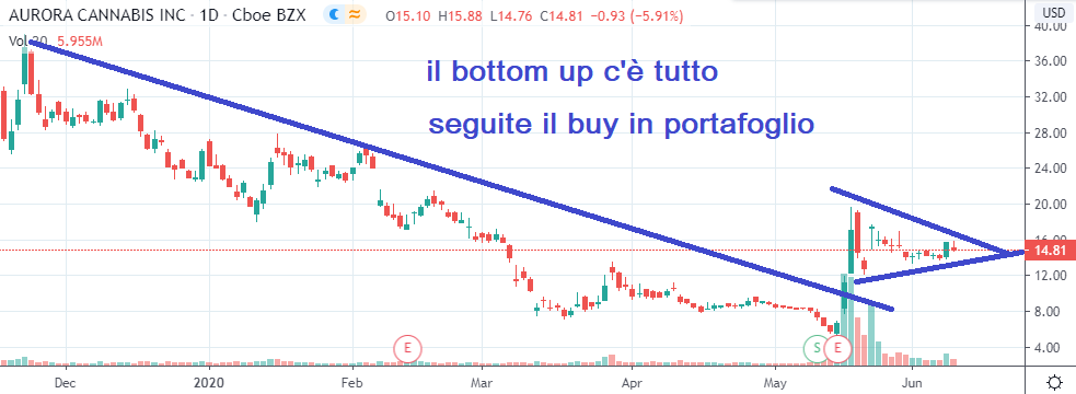 Abbiamo poi piazzato un buy su Aurora Cannabis sul Nasdaq (simbolo ACB) perché il pattern tecnico è assolutamente esplosivo e la convinzione che una maggiore liberalizzazione della mariuana negli USA spinge i prezzi da giorni.