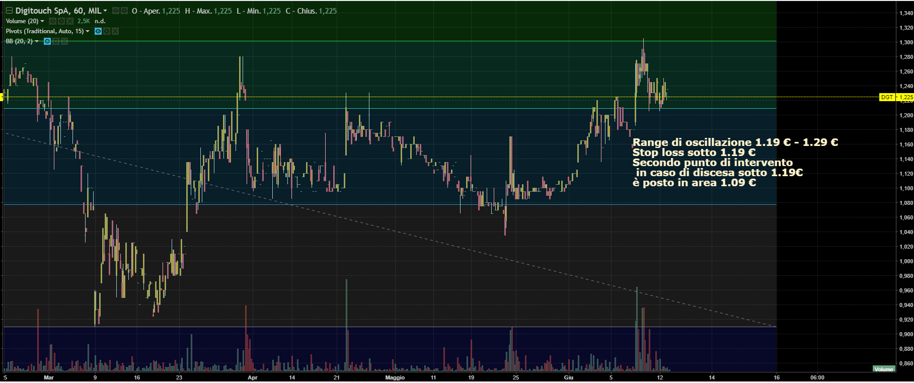 Come descritto in figura, il range di oscillazione è compreso tra 1.19€ e 1.29€.
