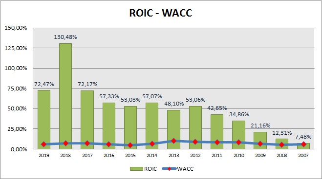 Il successo del modello di business di WINMARK CORP è rappresentato dal grafico qui sotto in cui emerge una dinamica impressionante assunta dal ROIC nei confronti del WACC. Tutto ciò non è altro che il risultato della compresenza di elevata marginalità e bassa intensità di capitale.