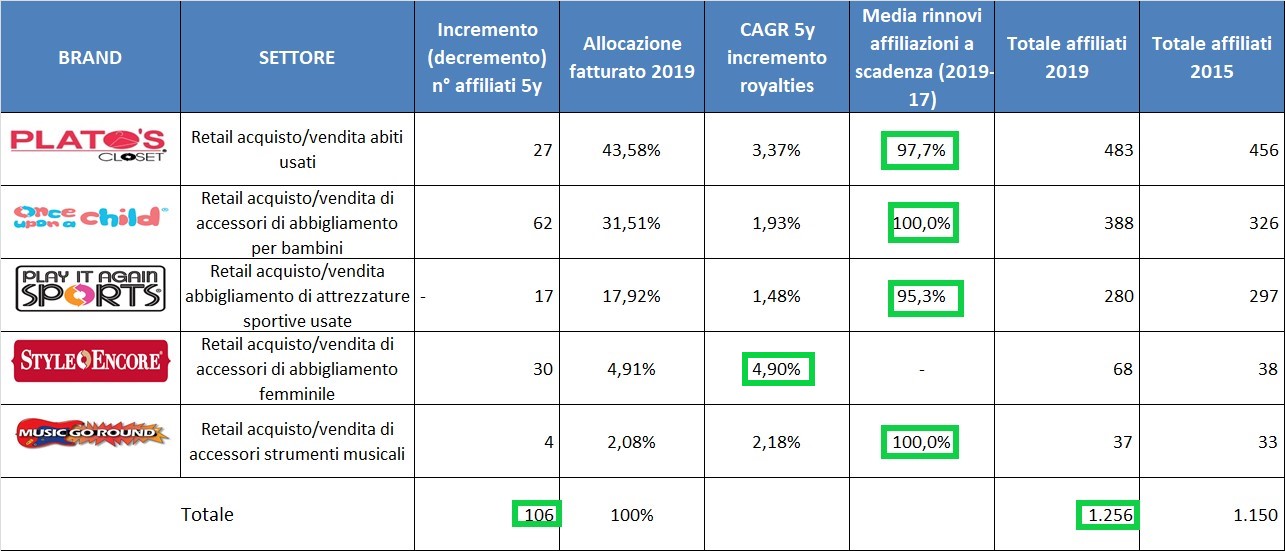Non si parla di automobili, ma bensì di abbigliamento (uomo, donna, bambino) ed in termini residuali anche di strumenti musicali. WINMARK CORP agisce negli Stati Uniti come franchisor attraverso 5 diversi brand (Plato's Closet, Once Upon A Child, Play It Again Sports, Style Encore e Music Go Round) ed in cambio delle royalties degli affiliati, conferisce il proprio know-how e la propria assistenza ai franchisee. Oltre a ciò, WINMARK CORP è attiva anche nel comparto del Leasing Strumentale (22% fatturato).