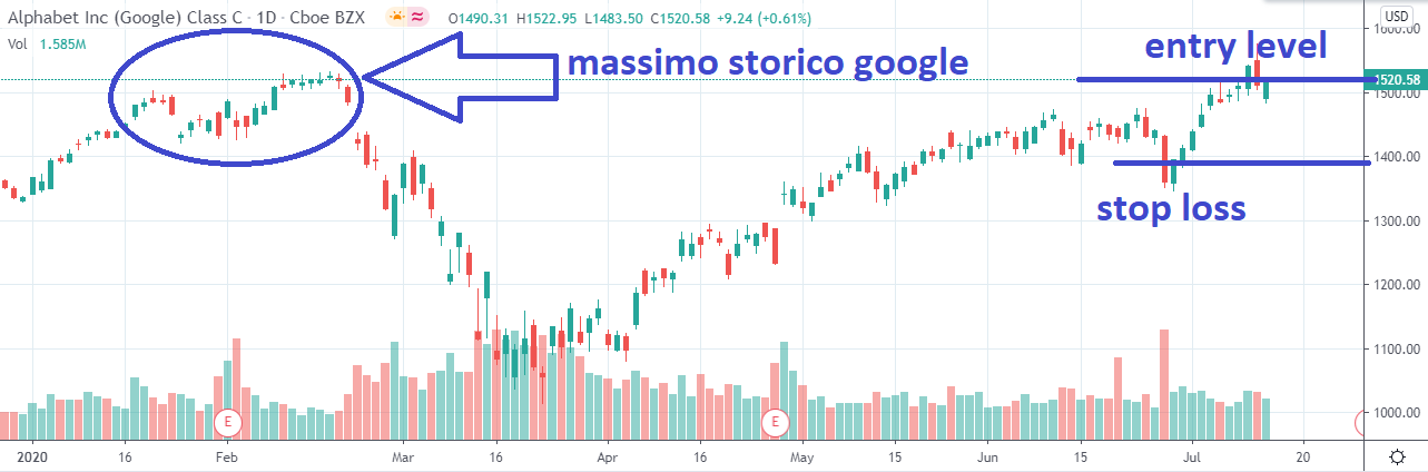 Compriamo GOOGLE (ALPHABET) a 1523 limite (ci aspettiamo apertura al rialzo in gap up) con stop loss a 1398 e target a 1656 limite.