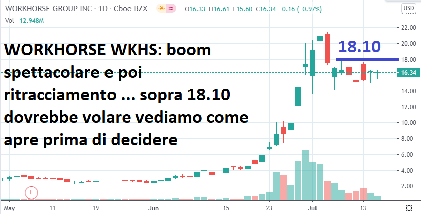 Ci piacerebbe comprare Workhorse simbolo WKHS, che è stata autorizzata da poco a fornire camion elettrici in California ed è il fornitore ufficiale di UPS di quei camion tipici di UP che si possono vedere nei film o anche sulle strade, a 18.10 stop ma mettendo lo stop loss a 14.00 rischieremmo troppo e questo non va bene.