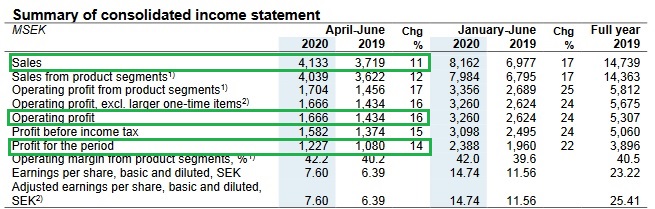 Il Q2 2020 si è concluso riportando un utile netto di M 1,227 SEK (€ 115 mln) in aumento del +14% rispetto ai M 1,08 SEK (€ 107,7 mln).