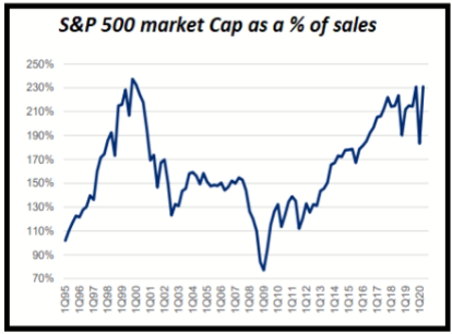 Tra i vari indici di valutazione spicca la “market cap to sales” giunta su livelli che storicamente hanno fatto da barriera ad ulteriori rialzi. E’ vero che l’ammontare di supporto fiscale e monetario erogato può giustificare, da solo, dei multipli stabilmente più elevati di quanto riportato dal grafico: