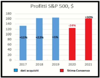 Come dicevamo prima con l’apertura della stagione delle trimestrali societarie, il mercato si sta mostrando ottimista circa l’impatto sui conti aziendali dalla crisi pandemica. Il consenso si attende un calo degli utili, tra le società dell’S&P500, del 24% per il 2020. Per il secondo trimestre, si stima oltre un 50% di calo. La visibilità è poca, in considerazione del fatto che oltre un terzo delle aziende ha ritirato la propria previsione e la dispersione tra i settori è enorme. In ogni caso, il target di consenso implica un forte recupero degli utili tra il terzo ed il quarto trimestre al fine di ridurre il calo accumulatosi nei primi 2 trimestri. Gli investitori, poi, guardano al 2021 nel quale le stime indicano un guadagno del + 30%, che porterebbe i profitti in linea col 2018 (v. grafico):