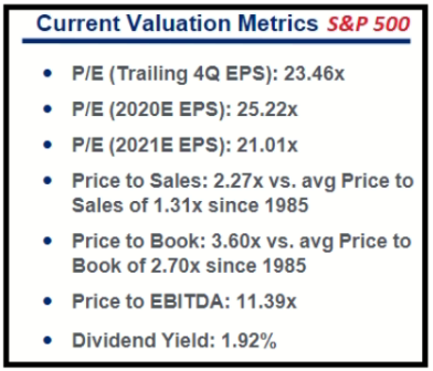 Il rally azionario ha spinto le valutazioni su livelli estremi, anche utilizzando le apparentemente generose stime di consenso, i PE trailing, e quelli basati sulle stime 2020 e 2021 sono superiori al 20x. Applicando 20x PE al livello utili del consenso per il 2021 otteniamo per l’S&P 500 alla fine dell’anno prossimo un livello di 3.200 punti. In altre parole, usando su uno scenario già benigno in termini di utili, un PE di oltre 3 punti superiore a quello medio degli ultimi 5 anni, otteniamo un target che non implica, praticamente, alcun progresso dell’indice nei prossimi 18 mesi (v. grafico):