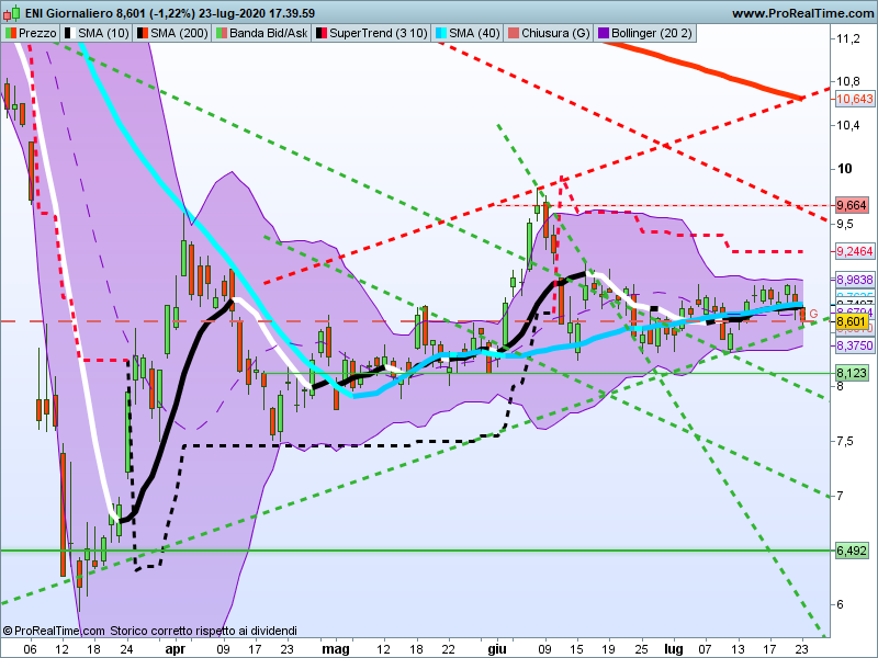 Il grafico seguente (di Pro Real Time) evidenzia come la quotazione attuale si muova fra un supporto a 8,123 euro e una resistenza a 9,664 euro. Eccoli i riferimenti di cui tenere conto prima e dopo il 30 luglio.