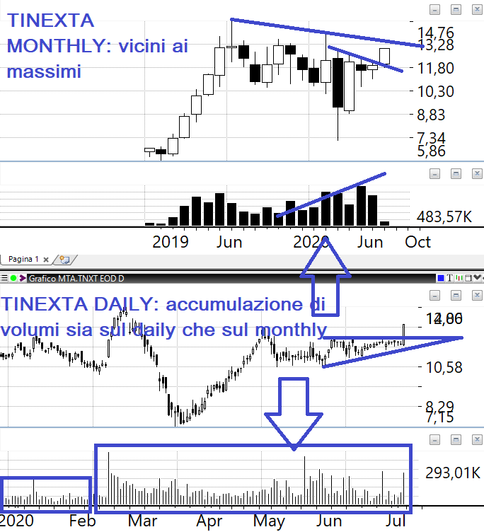 Tinexta: forte accumulazione di volumi, sembra che l’azione voglia staccare e dirigersi verso i massimi storici. Con la barra di venerdì abbiamo anche il momentum … a livello di bilancio il primo trimestre ha subito l’effeto coronavirus ma i datti sembrano limitati.