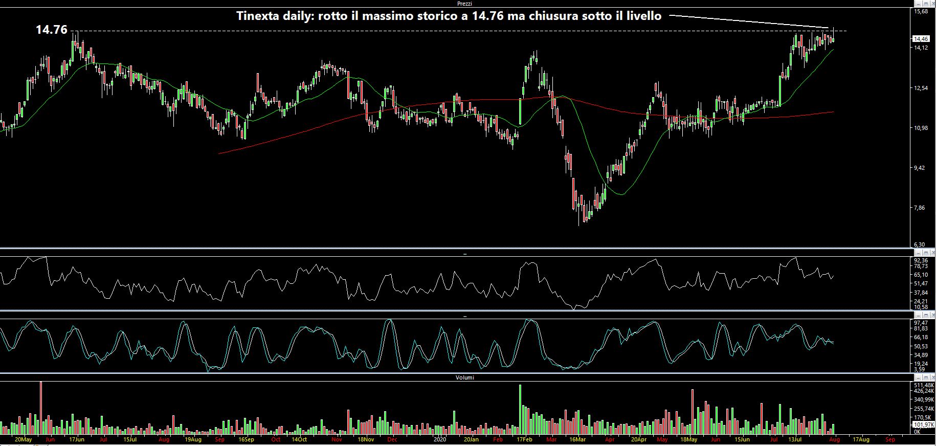 Altra azione di cui avevo fatto menzione sabato scorso è il titolo Tinexta, che in settimana ha mostrato un'ottima forza relativa ma non è riuscita a confermare il livello rotto: 14.76 eventualmente filtrabili a 14.80. Abbiamo tuttavia notato come sia stata estremamente precisa nella tenuta dei 14 euro che avevo indicato e che sono stati testati almeno un paio di volte, come potete notare nel grafico a 30 minuti (https://www.lombardreport.com/2020/7/25/analisi-settimanale-del-mercato/). Nella seduta di venerdì abbiamo infatti assistito alla rottura dei massimi storici, senza però riuscire a produrre quell'allungo che poteva essere lecito sperare, forse a causa del crollo del mercato italiano nel pomeriggio. Ad ogni modo per i traders intraday c'è stata comunque la possibilità di uscire in pari o in leggerissimo loss: se, dopo la rottura di un'area così importante, per oltre tre ore l'azione non prosegue nel movimento e gli scambi latitano qualche dubbio sulla validità del segnale può venire. Sul daily porrei estrema attenzione alla tenuta dei minimi di giovedì a 14.28.
